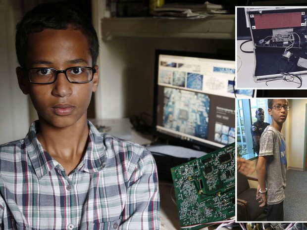 Ahmed, que é fã de robótica, levou à escola um relógio feito por ele mesmo para impressionar sua nova professora. Ele, no entanto, acabou sendo retirado de sua escola algemado porque a docente confundiu sua criação com uma bomba e chamou a polícia.