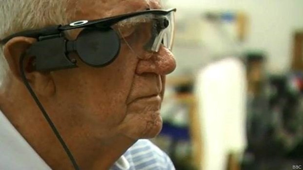 Ele passou a usar um implante na retina, que converte imagens de vídeo vindas de uma pequena câmera que ele usa nos óculos.