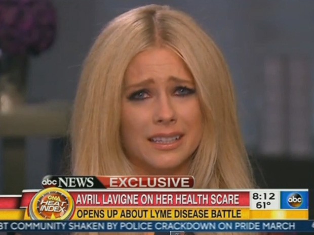 Cantora Avril Lavigne se emociona ao falar sobre a doença de Lyme em entrevista ao programa de TV ‘Good Morning America’ nesta segunda (29) (Foto: Reprodução/ABC News)Avril Lavigne disse que está vendo progresso em seu tratamento para a doença de Lyme, que a atingiu no ano passado, enquanto ela estava em turnê. A cantora deu uma entrevista ao programa de TV “Good Morning America” nesta segunda (29) e falou que está tomando vários antibióticos e descansando em sua casa em Ontario, no Canadá.