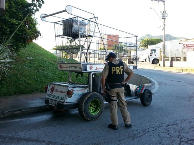 Carrinho não tinha autorização para trafegar em rodovias (Foto: PRF/Divulgação)Um carrinho de supermercado ‘gigante’, acoplado a um veículo monoposto, foi apreendido na tarde desta segunda-feira (30) na BR-101, nas imediações de Biguaçu na Grande Florianópolis.