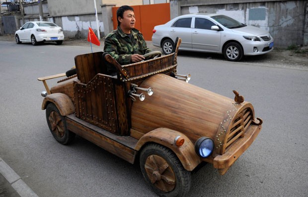 Liu Fulong criou um carro elétrico feito de madeira (Foto: China Daily/Reuters)