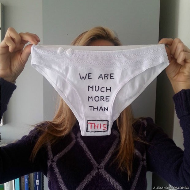 Palombo pediu que mulheres de todo o mundo escrevessem mensagens em calcinhas contra o machismo e a violência de genêro.