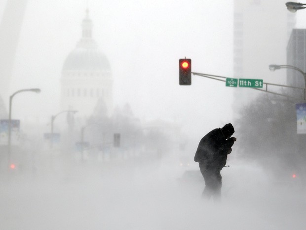 Pessoa atravessa a rua na cidade de St. Louis, no Missouri (Foto: Jeff Roberson/AP)Pessoa enfrenta o frio ao atravessar uma rua na cidade de St. Louis, no Missouri (Foto: Jeff Roberson/AP)