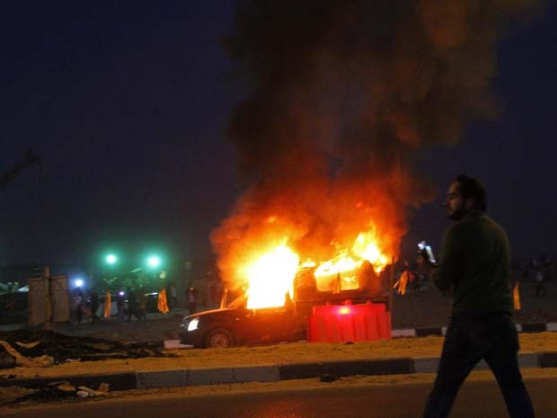 Torcedor é visto perto de carro policial que pega fogo após confrontos entre policiais e torcedores perto de estádio de futebol no Cairo (Foto: REUTERS/Stringer)Confrontos entre a polícia e torcedores da equipe de futebol Zamalek, nos arredores de um estádio de futebol no nordeste do Cairo, deixaram mortos e feridos neste domingo (8) à noite.