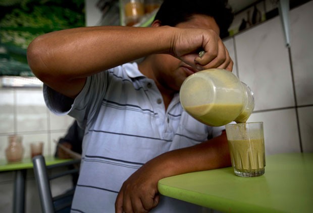 Suco de rã faz sucesso no Peru (Foto: Rodrigo Abd/AP)Para fazer a mistura, que é vendida na região peruana dos Andes e também em algumas barracas na capital Lima, os vendedores retiram a pele da rã e, depois, batem em um liquidificador com cenouras, a raiz de maca peruana e mel.