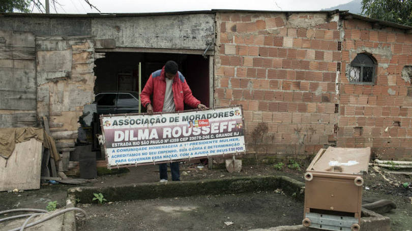 Na Comunidade Dilma Rousseff, o chão está cheio de lixo queimado e pedaços de tijolos. A placa em homenagem a Dilma está jogada ali desde 26 de junho, dia em que a revista Veja publicou uma matéria sobre supostas doações ilegais feitas à campanha de reeleição da presidente em 2014 e reinflamou os pedidos de impeachment.