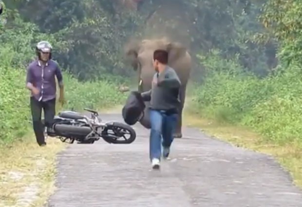 O indiano Jasoprakas Debdas flagrou um motociclista e um passageiro abandonando uma moto em uma estrada na Índia após se depararem com um elefante irritado.