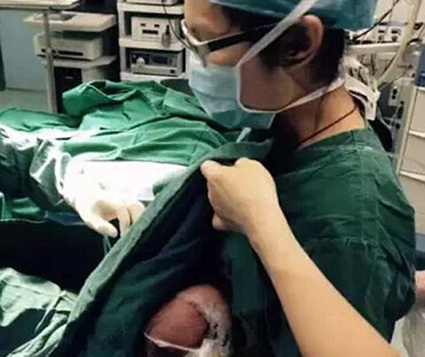 A enfermeira amamenta o bebê, enquanto médicos realizam a cirurgia (Foto: Reprodução)
