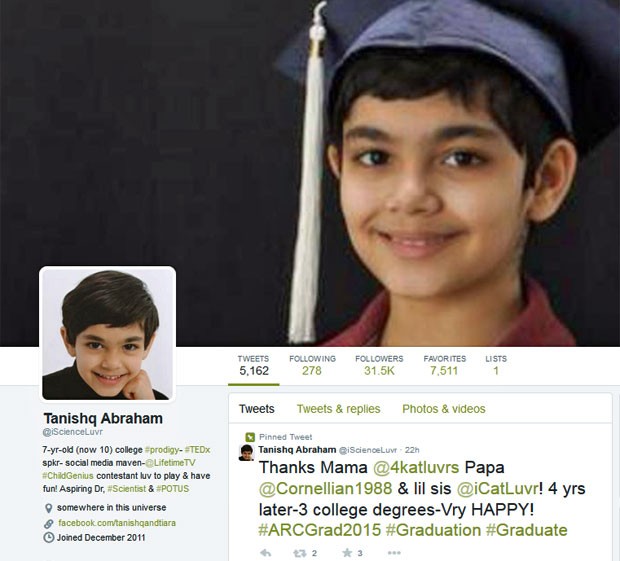 Aos 11 anos, Tanishq Abraham, dos EUA, conquistou o diploma do ensino superior (Foto: Reprodução/Twitter/iscienceluvr)Aos 11 anos, Tanishq Abraham, dos EUA, conquistou o diploma do ensino superior