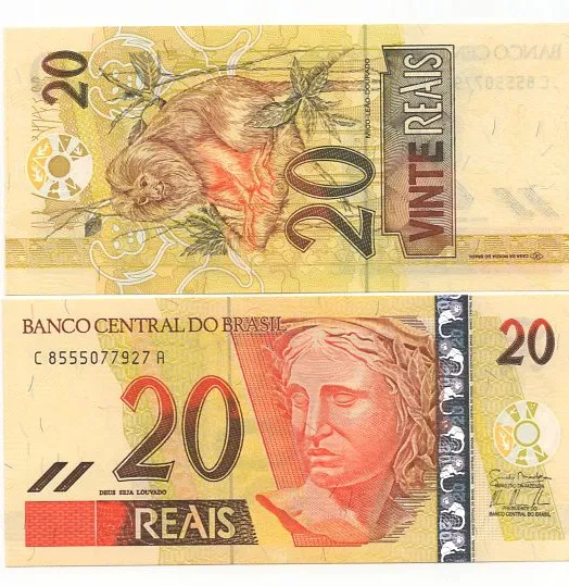 Em 2002, a nota de R$ 20,00 foi introduzida no cenário financeiro brasileiro, seu rosto exibe uma boneca simbólica da República, artisticamente interpretada como uma estátua, enquanto a parte de trás mostra a figura de um mico-leão-dourado , o mico-dourado foi usado em homenagem à luta pela preservação da espécie brasileira ameaçada de extinção.
