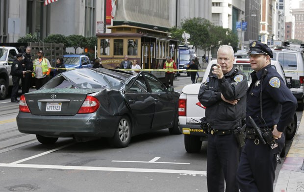 Visão superior mostra o carro amassado guardado pela polícia em San Francisco (Foto: AP/Eric Risberg)Visão superior mostra o carro amassado guardado pela polícia em San Francisco (Foto: AP/Eric Risberg)
