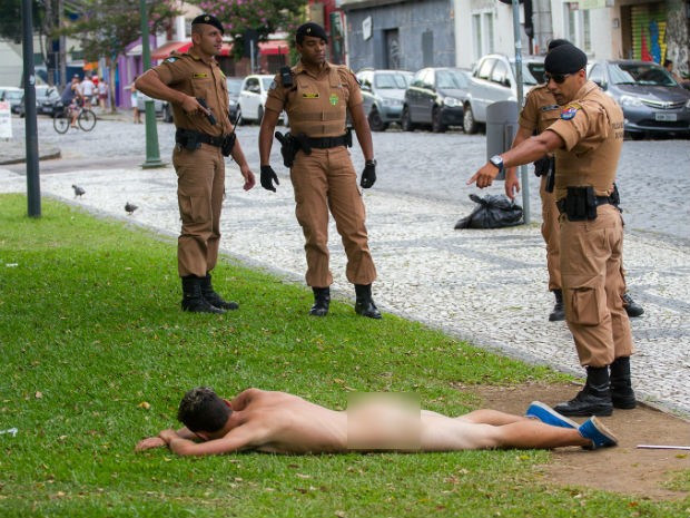 Um homem foi flagrado andando sem roupas no final da tarde de domingo (18) próximo a Praça Doutor João Cândido, no Alto do São Francisco, região central de Curitiba. De acordo com o fotógrafo Julio Garrido, que presenciou a cena, o homem disse ter sido assaltado. A Polícia Militar informou que foi até o local, abordou o jovem e entregou uma sacola para que ele se cobrisse. Um dos policiais apontou uma arma para o homem nu.