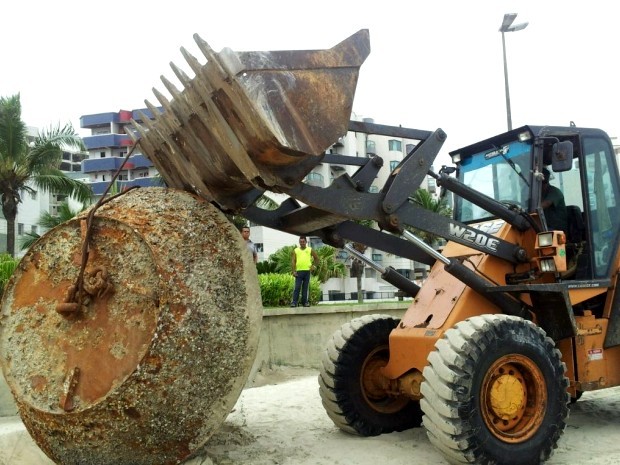 Por volta das 16h desta sexta-feira, funcionários da prefeitura amarraram uma espécie de cabo de aço no objeto e tentaram retirá-lo da faixa de areia com uma retroescavadeira. Por conta do peso, o maquinário utilizado não foi suficiente. A reportagem conversou com técnicos que estão no local e eles disseram que vão aguardar a chegada de um equipamento com maior potência para, enfim, supender o material e tirá-lo do local. A prefeitura confirmou que será preciso um caminhão especial e a remoção deve ser feita até a próxima segunda-feira. A preocupação é que alguém se machuque, já que o objeto está enferrujado e pode causar acidentes.