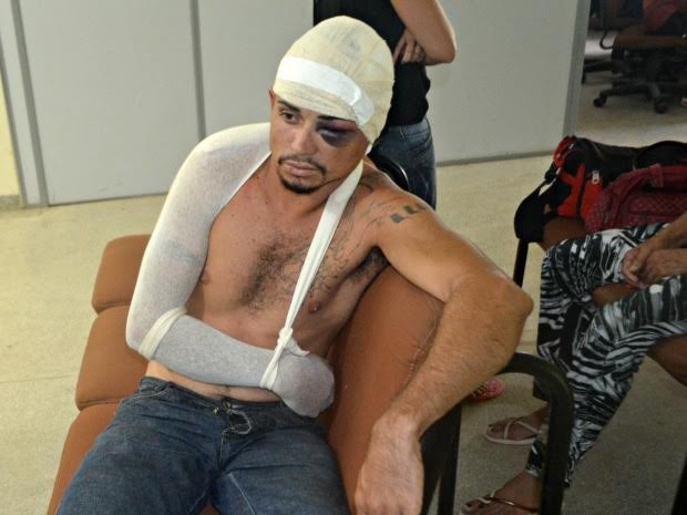 Homem foi espancado após dar empurrão na esposa (Foto: Adelcimar Carvalho/ G1)Com o braço e cabeça enfaixados e um olho roxo, Jardson Souza Costa, de 26 anos, chegou a delegacia de Cruzeiro do Sul para prestar depoimento. Ele foi espancado no domingo (31) supostamente pelo sogro após agredir a esposa, no bairro Miritizal. De acordo com a polícia, o pai da vítima, revoltado com a agressão, teria atacado o suspeito com um pedaço de ferro. Jardson sofreu luxação no ombro direito, escoriações pelo corpo, rosto e cabeça.