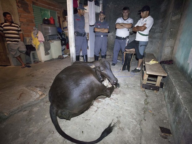 Uma vaca quebrou o teto e foi parar dentro de uma casa no bairro dos Pimentas, em Guarulhos, na Grande São Paulo, segundo relatos de testemunhas ouvidas pelo Centro de Controle de Zoonoses (CCZ) do município.